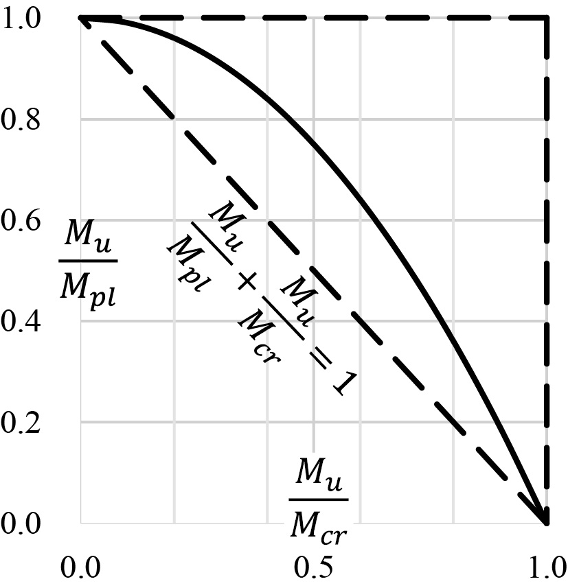 Формула Мерчанта является одним из возможных способов решить деформационную задачу устойчивости плоской формы изгиба двутавровой балки. В самом общем смысле расчет по Мерчанту на устойчивость представляется в форме, приведенной из двух линейных систем – линейно-упругой системы и жесткопластической на предельное равновесие. Графически уравнение Мерчанта можно представить в виде треугольника, который показан пунктирной линией на рис. 5. Сплошной кривой линией описывается реальное поведение балки, когда уравнение имеет некоторую степень n. При n = 1 уравнение Мерчанта образует нижнюю и верхние границы, куда заключена реальная кривая со степенью n:
