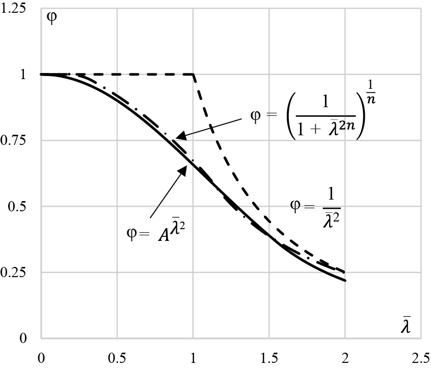 Формула (78) была разработана в методе предельных состояний R.H.R. Tide в 1984 году [13] с целью уйти от мультикривых устойчивости колонн к одной кривой, которые были разработаны комитетом стального строительства США и R. Bjorhovde в 60-х годах [14]. На рис. 6 наглядно показано, как показательная зависимость (78) способна описать кривую устойчивости в области средней и малой гибкостей.
