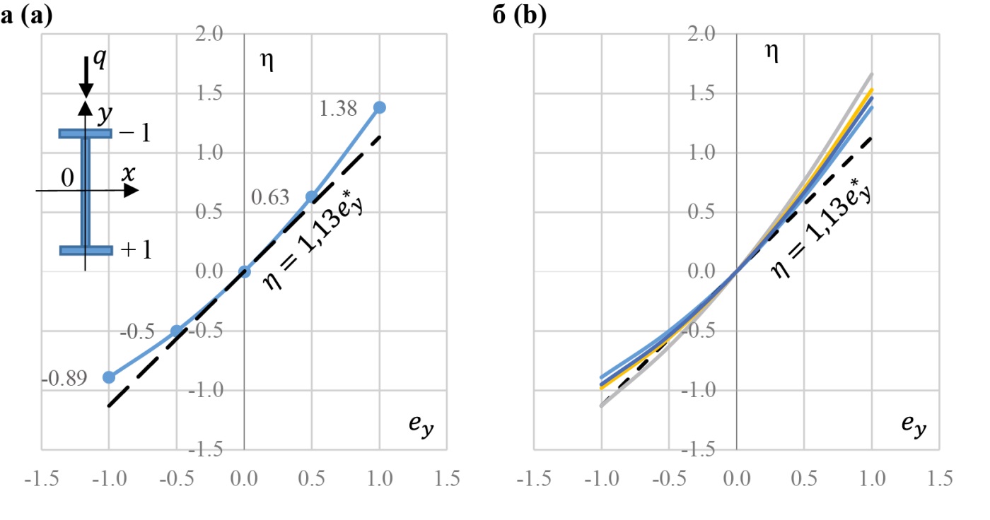 В (16) присутствует эксцентриситет ey, который определяет место приложения поперечной нагрузки по высоте сечения. ey заключен в границы, считая, что центр тяжести и центр изгиба балки – это ноль: