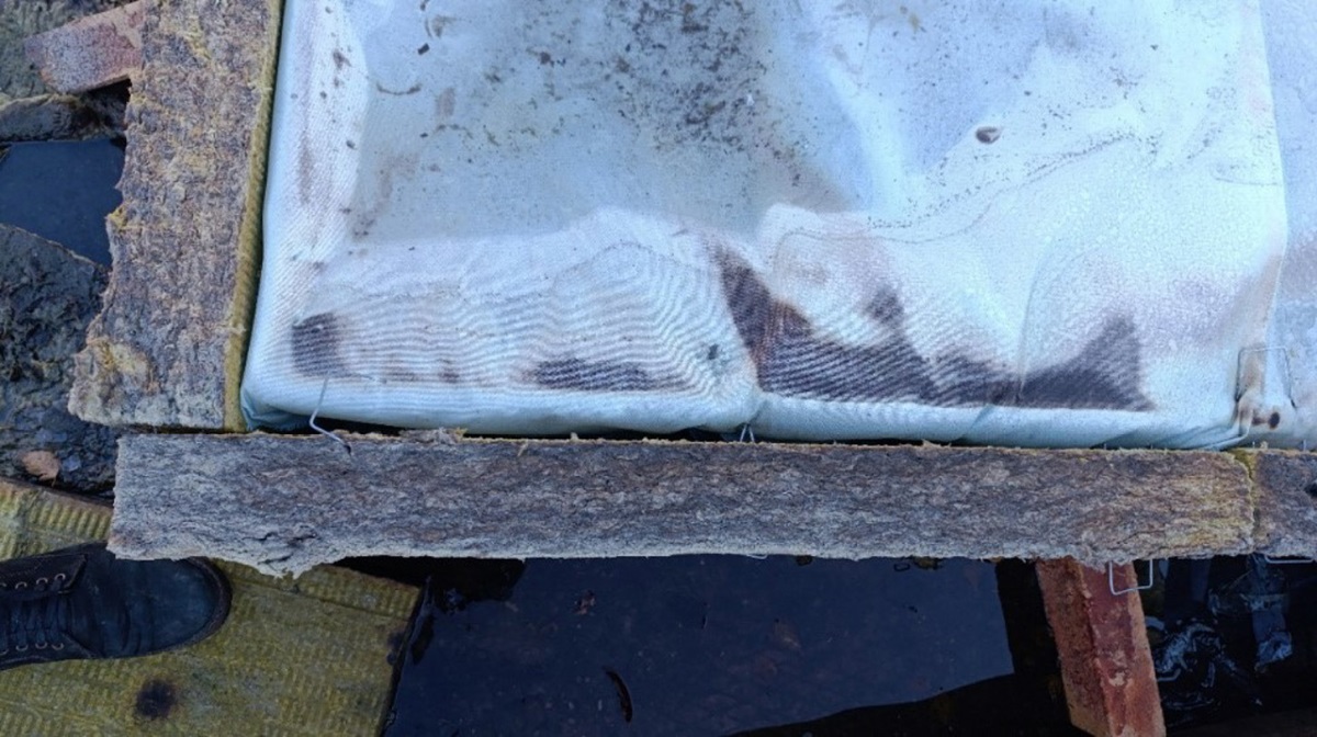 Образец № 1 – противопожарная стеклоткань имеет минимальные повреждения. ПВХ мембрана без повреждений. Теплоизоляционный слой «Пеноплэкс» без повреждений.