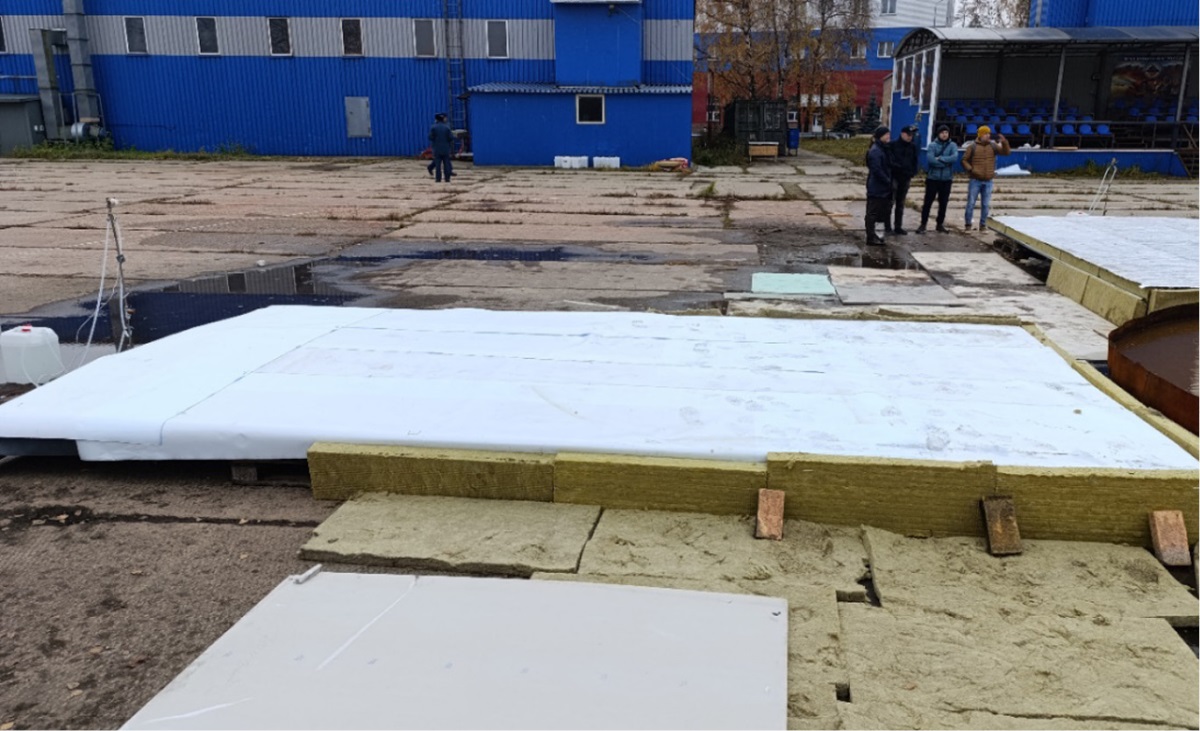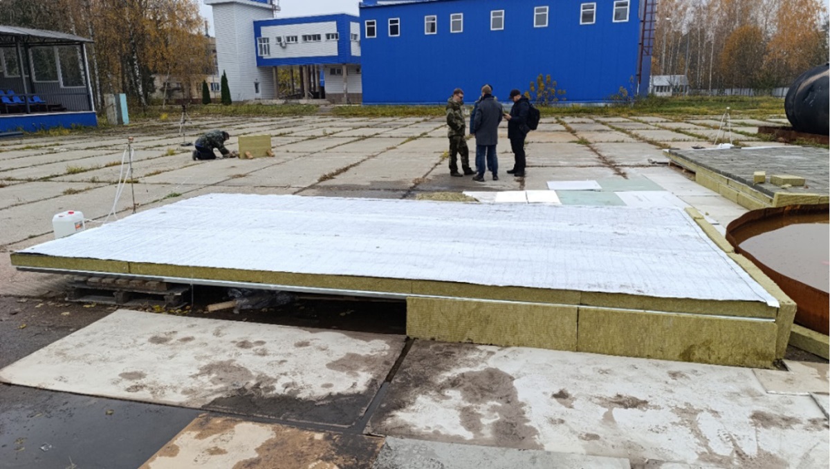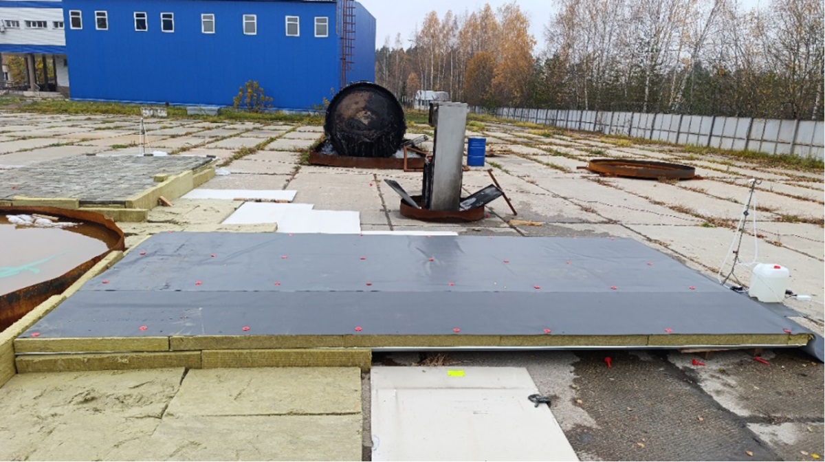 На основание из профилированного настила был уложен пароизоляционный слой из полимерной пленки и теплоизоляционный слой из минераловатных плит «Техно Т 100» толщиной 100 мм, плотностью 100 кг/м³, группа горючести – НГ. Теплоизоляционный слой крепили к несущему профилированному настилу при помощи полимерного тарельчатого дюбеля и металлического самореза. Поверх утеплителя укладывался водоизоляционный ковер из кровельной полимерной мембраны на основе высококачественного пластифицированного поливинилхлорида (ПВХ), армированного полиэстеровой сеткой «Logicroof V-RP». Защитный слой противопожарного пояса не укладывался. Готовый образец перед испытаниями показан на рис. 3.