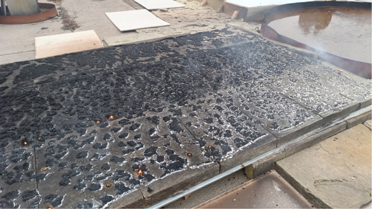 На рис. 9 представлен внешний вид образца № 1 после испытания. ПВХ мембрана под плиткой оплавилась по краям, но не воспламенилась. Минераловатный утеплитель оплавился в зоне огневого воздействия.