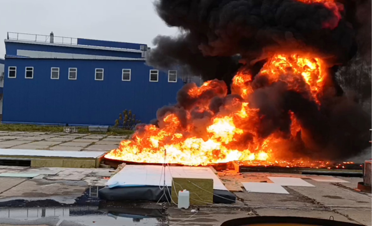 - Ветровое воздействие на очаг возгорания во время испытания № 2 было достаточно сильным. Огневая нагрузка от очага пожара совместно с огневой нагрузкой от горевших материалов образца № 3 частично повредила измерительное оборудование. Целесообразно провести дополнительные научно-исследовательские и опытно-конструкторские работы по оценке достаточности ширины противопожарного пояса 6 метров для воспламенения кровли за противопожарным поясом в случае более длительного огневого испытания (до 30 минут) или более интенсивного ветрового воздействии на очаг возгорания в направлении противопожарного пояса.