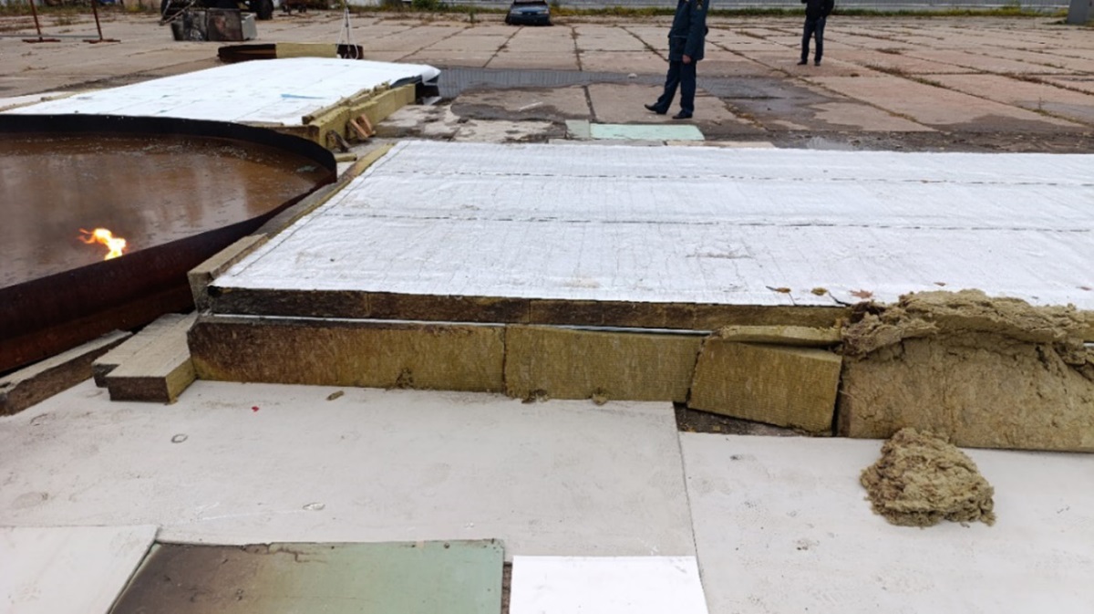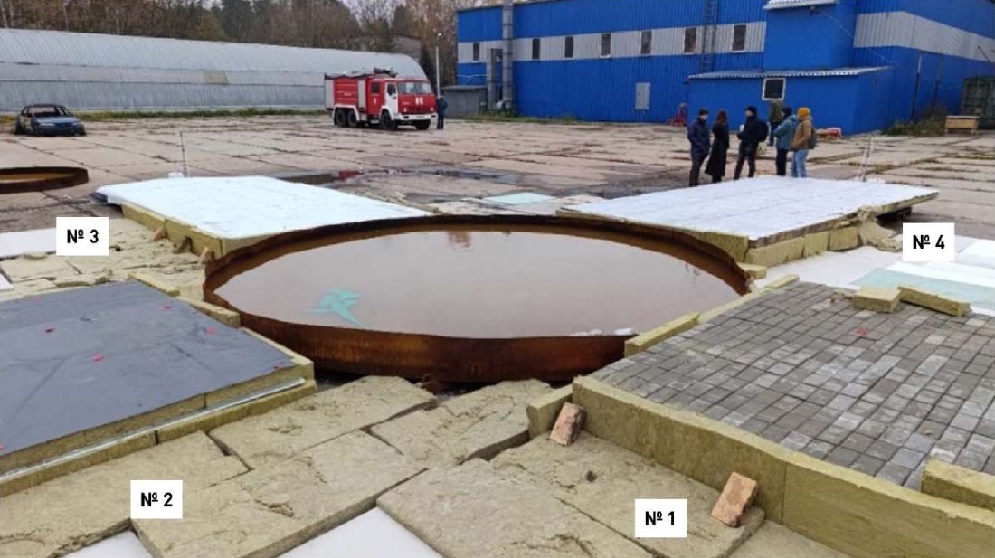 Для проведения испытаний ванну заполняли авиационным керосином марки ТС-2. При диаметре ванны 4500 мм и уровне жидкости 150 мм расчетный объем топлива составил 2,39 м³, а расчетная площадь зеркала горения жидкости составила 15,9 м². Отсчет времени воздействия открытого пламени на испытуемый образец производился с момента полного охвата пламенем всей площади ванны для горючей жидкости.