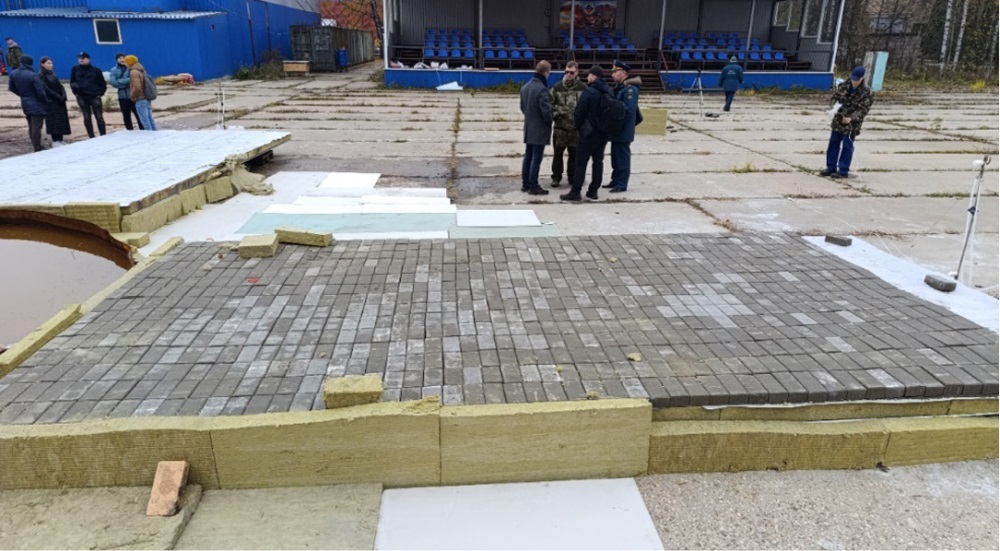 Защитный слой противопожарного пояса формируется мелкоразмерной тротуарной плиткой толщиной 60 мм, уложенной на цементно-песчаный раствор. Готовый к испытаниям образец 1-го типа показан на рис. 1.