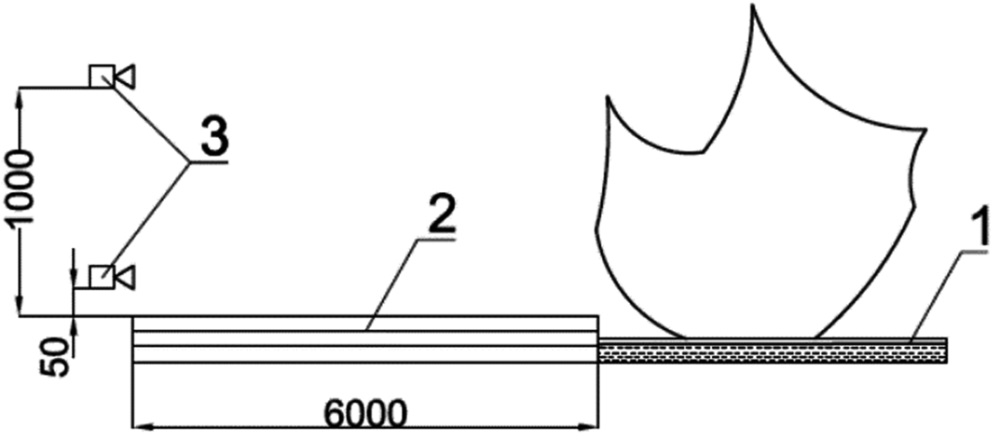Наружную поверхность исследуемых образцов располагали на одной высоте с бортами ванны для горючей жидкости. На расстоянии 6000 мм от ванны и на высоте 50 и 1000 мм от поверхности образцов размещались датчики теплового потока и термоэлектрические преобразователи, направленные в сторону ванны. Термоэлектрические преобразователи размещались на подложках из древесины или деревосодержащих материалов группы горючести Г4, размерами (50 × 50) ± 20 мм, покрашенных в черный цвет. Крепление термопар к подложкам проводили в соответствии с [6]. Схемы размещения опытных образцов и средств измерения относительно источника горения представлены на рис. 5 и 6.