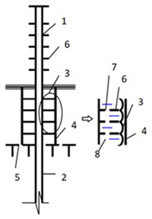 1 – конденсатор; 2 – испаритель; 3 – эластичная емкость с жидкостью, замерзающей при отрицательной температуре (зеротер); 4 – теплоизолированная жесткая оболочка зеротера; 5 – подошва слоя сезонного оттаивания грунта; 6 – оребрение; 7 – отверстия в оребрении; 8 – жидкость, замерзающая при отрицательной температуре