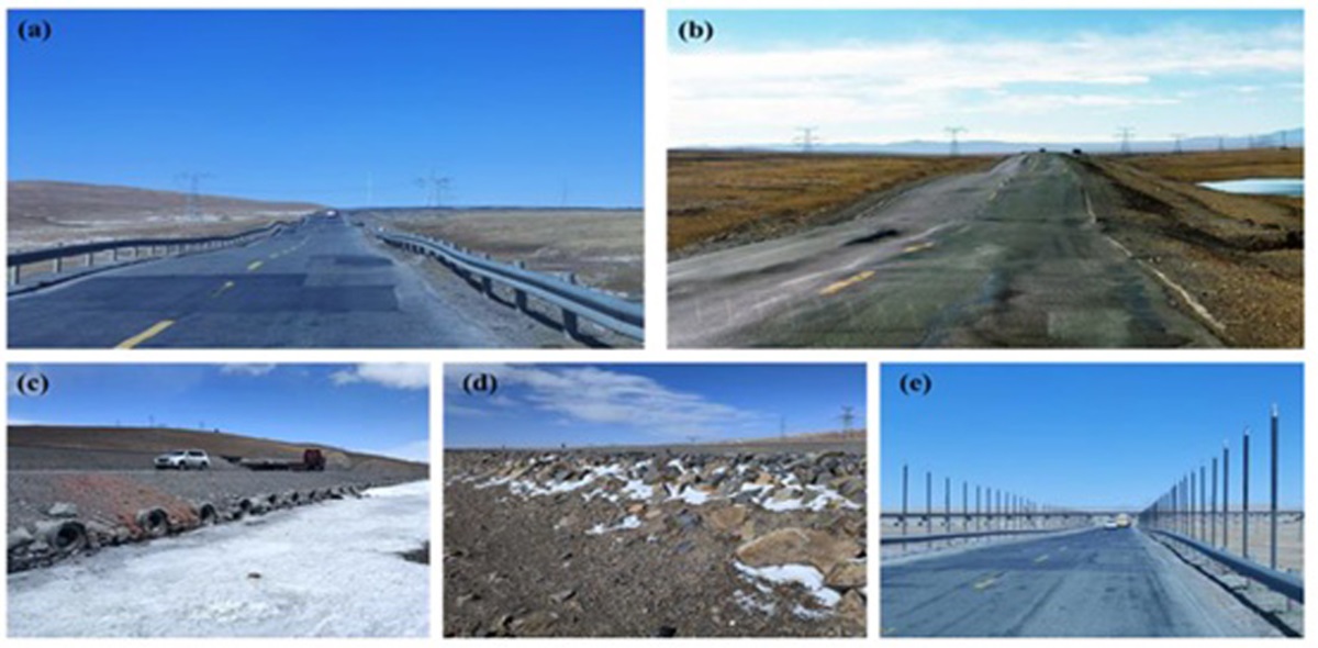 Fig. 4. Qinghai–Tibet Highway: (a) and (b) – road surface deformation; (c) – ventilated embankment; (d) – rock fill; (e) – thermosyphons along the road (E. Yarmak [9])