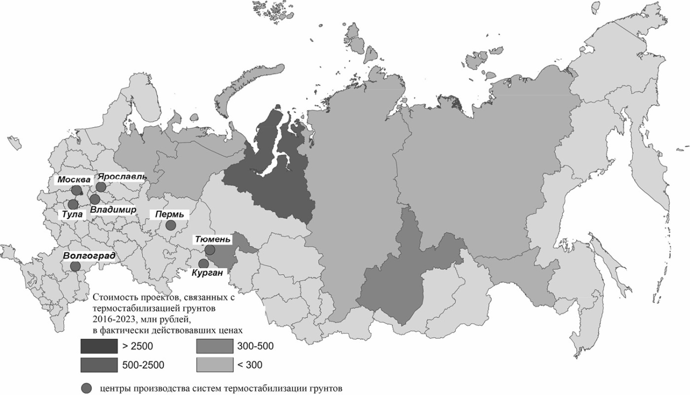 Для того, чтобы проанализировать спрос на системы термостабилизации, в отсутствии официальной статистики по данному виду продукции можно обратиться к открытому Интернет-ресурсу «РосТендер» [13], на котором органы государственной власти и иные акторы размещают закупки на осуществление различных работ. По состоянию на июль 2023 года количество заявок, связанных с термостабилизацией грунтов, по информации ресурса «РосТендер», составляет 141, по 84 заявкам указана информация по планируемому объему инвестиций. На первом этапе исследования была создана база данных этих проектов, включающая в себя следующую информацию: отраслевая принадлежности проекта; место реализации (субъект РФ); место реализации (город/муниципальный район); наименование проекта; наименование работ (разработка проектной документации, производство, поставки термостабилизаторов, работы по замене холодильных агрегатов, демонтажу и техническому обслуживанию, работы по капитальному ремонту, строительно-монтажные работы (установка термостабилизаторов), технический надзор, технические испытания, экспертиза промышленной безопасности систем термостабилизации грунтов); объект, нуждающийся в термостабилизации; начальная цена. На основании располагаемых данных общий объем инвестиций на реализацию указанных заявок превышает 11 млрд рублей (табл. 1).