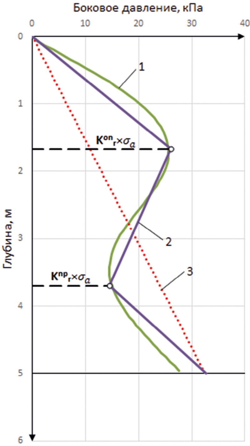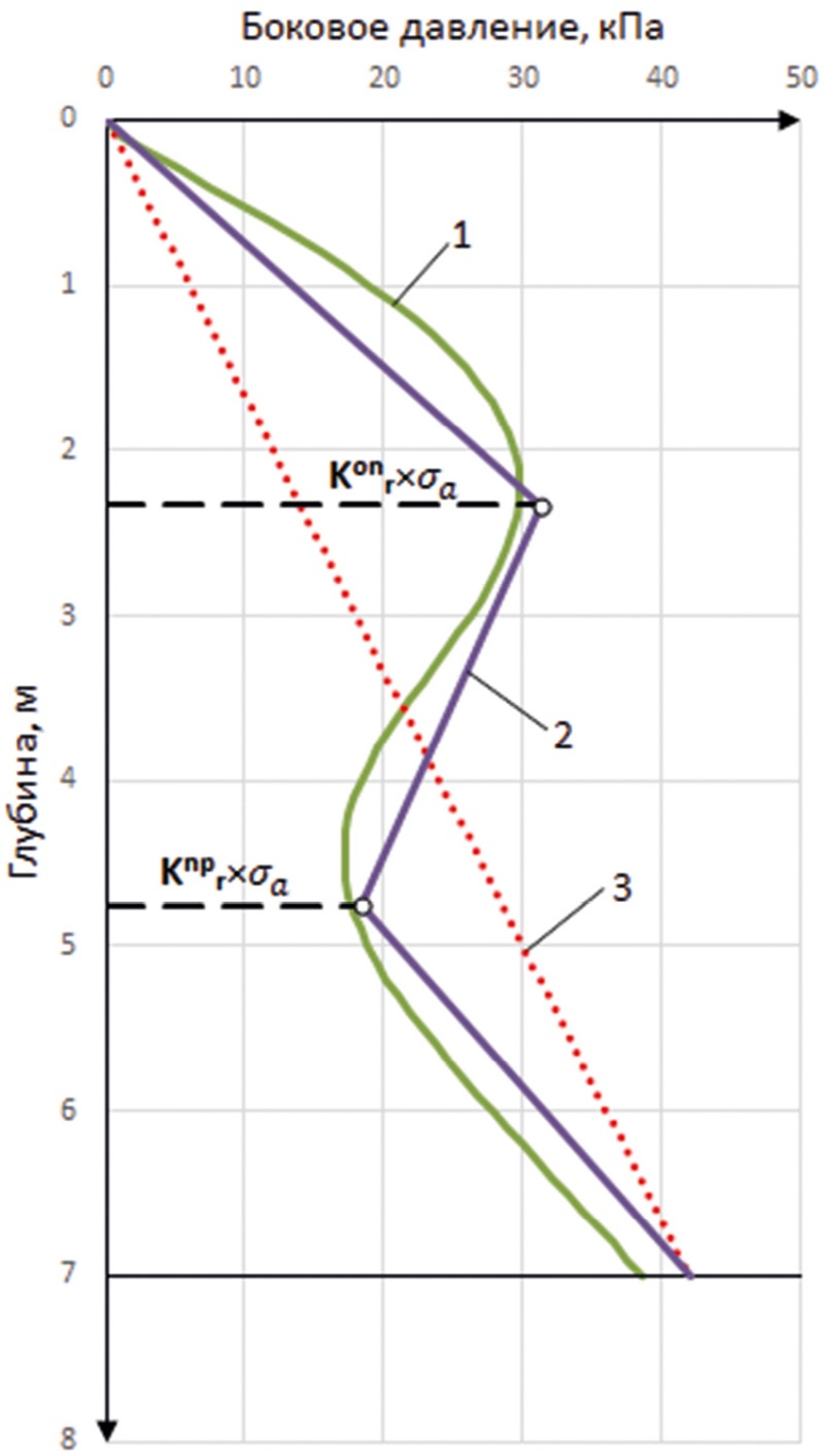 После определения поправочных коэффициентов (Kопr = 2,27 и Kпрr = 0,65) и соответствующих им уровней характерных точек изменения бокового давления грунта необходимо выполнить геометрические построения в соответствии со схемой (рис. 4).