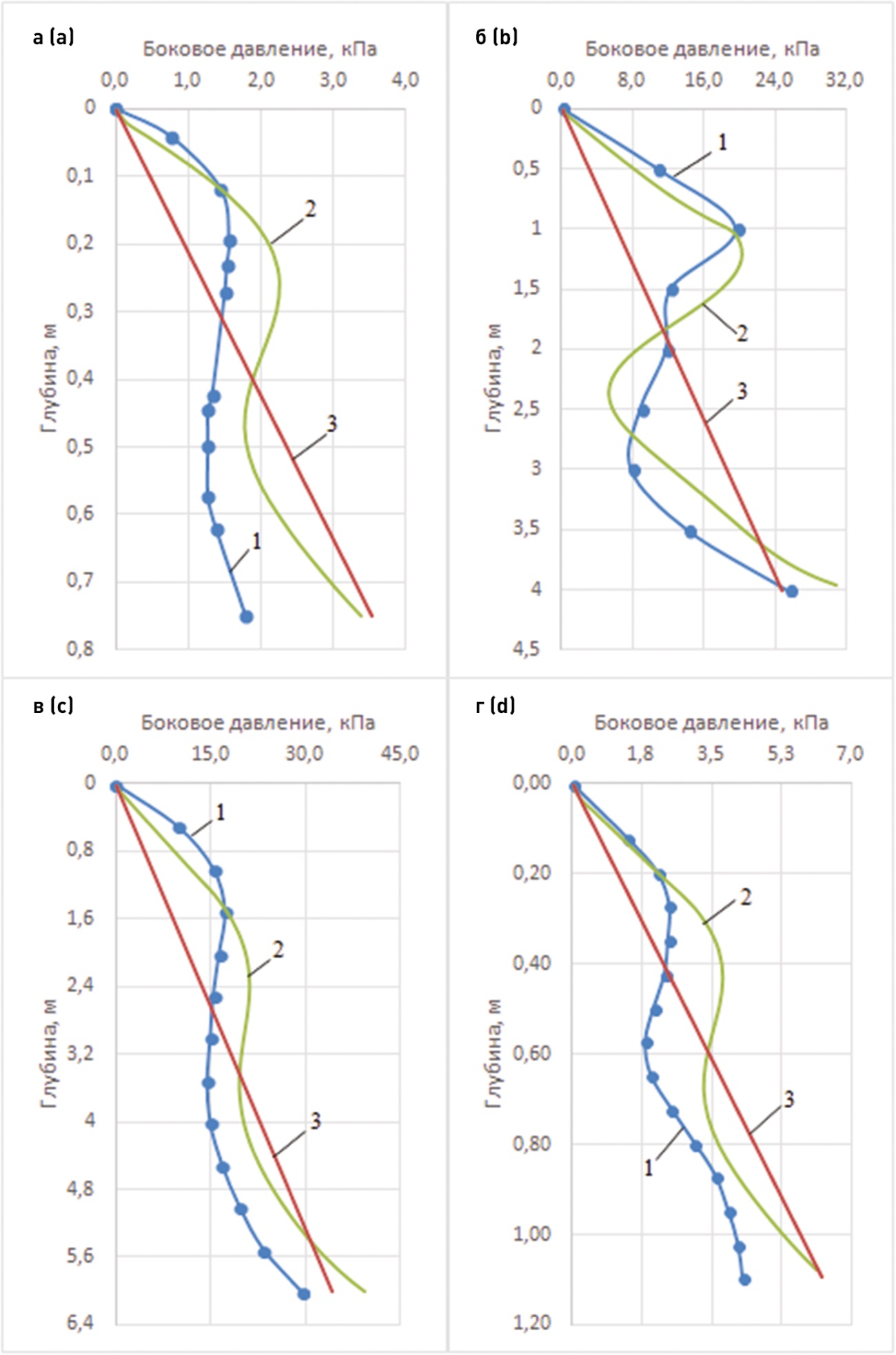 1 – experimental diagram of the earth pressure; 2 – calculated using the inclined block method; 3 – according to Coulomb’s law