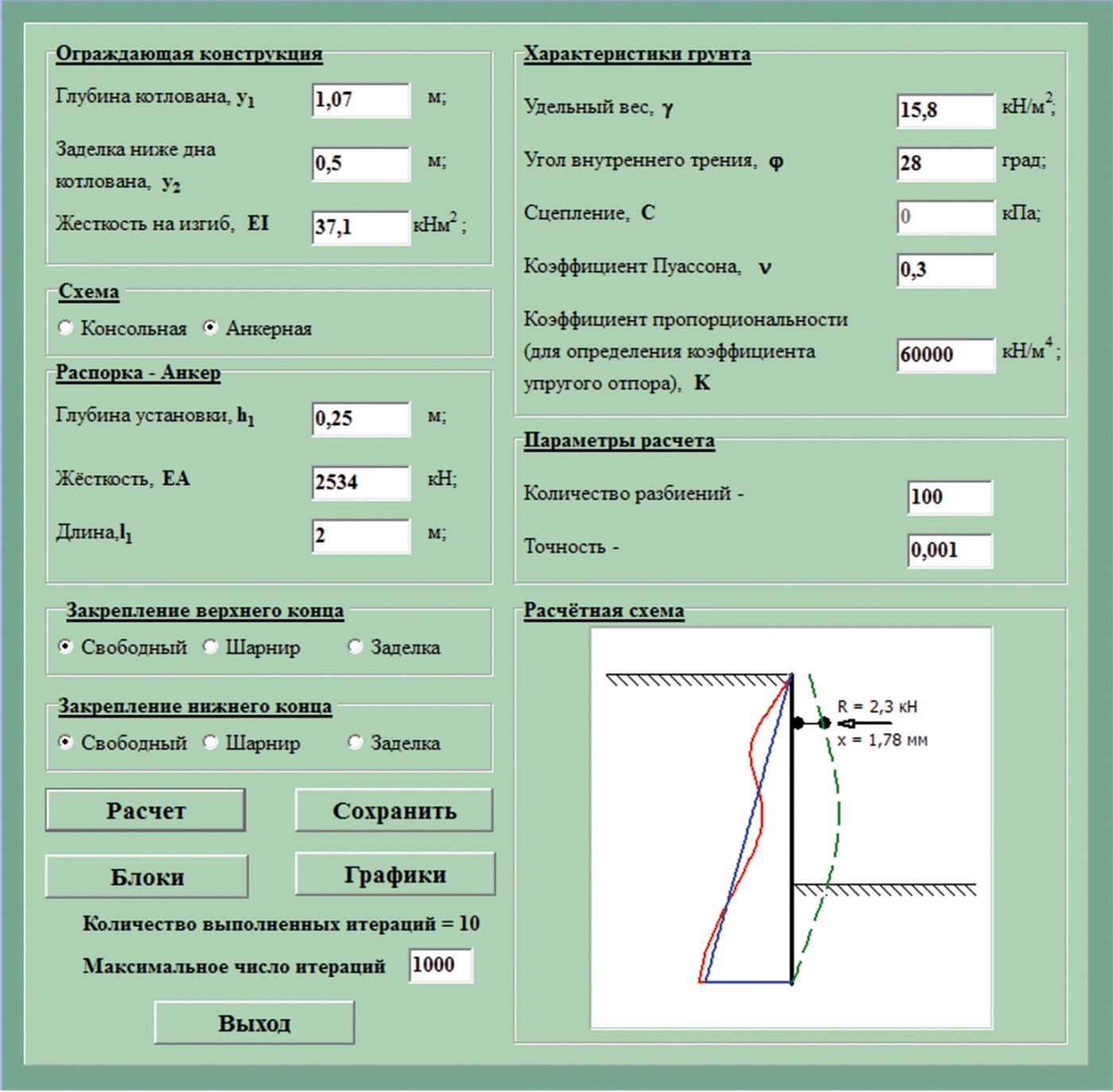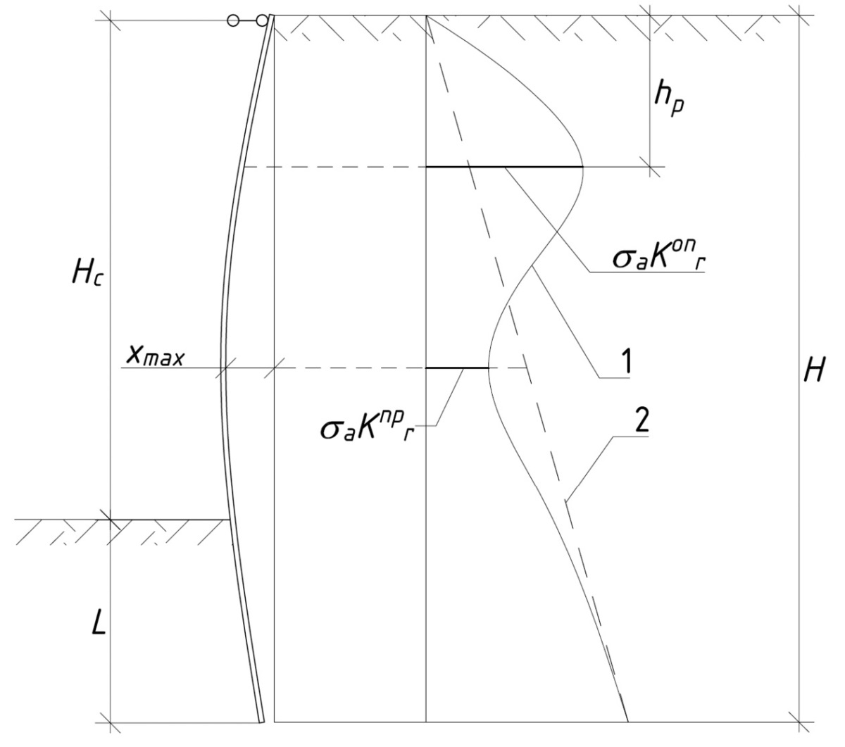 Fig. 2. The calculation of retaining structure in accordance with the experiment of G.E. Lazebnik and E.I. Chernysheva
