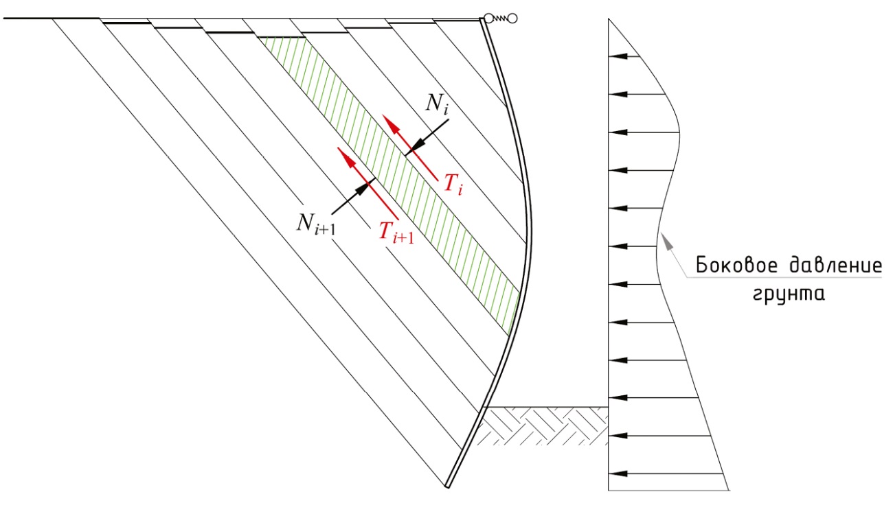 Метод заключается в определении и учете сил взаимного воздействия между элементарными наклонными блоками внутри призмы обрушения, которые непосредственно определяют характер перераспределения бокового давления грунта на ограждающую конструкцию (рис. 1).