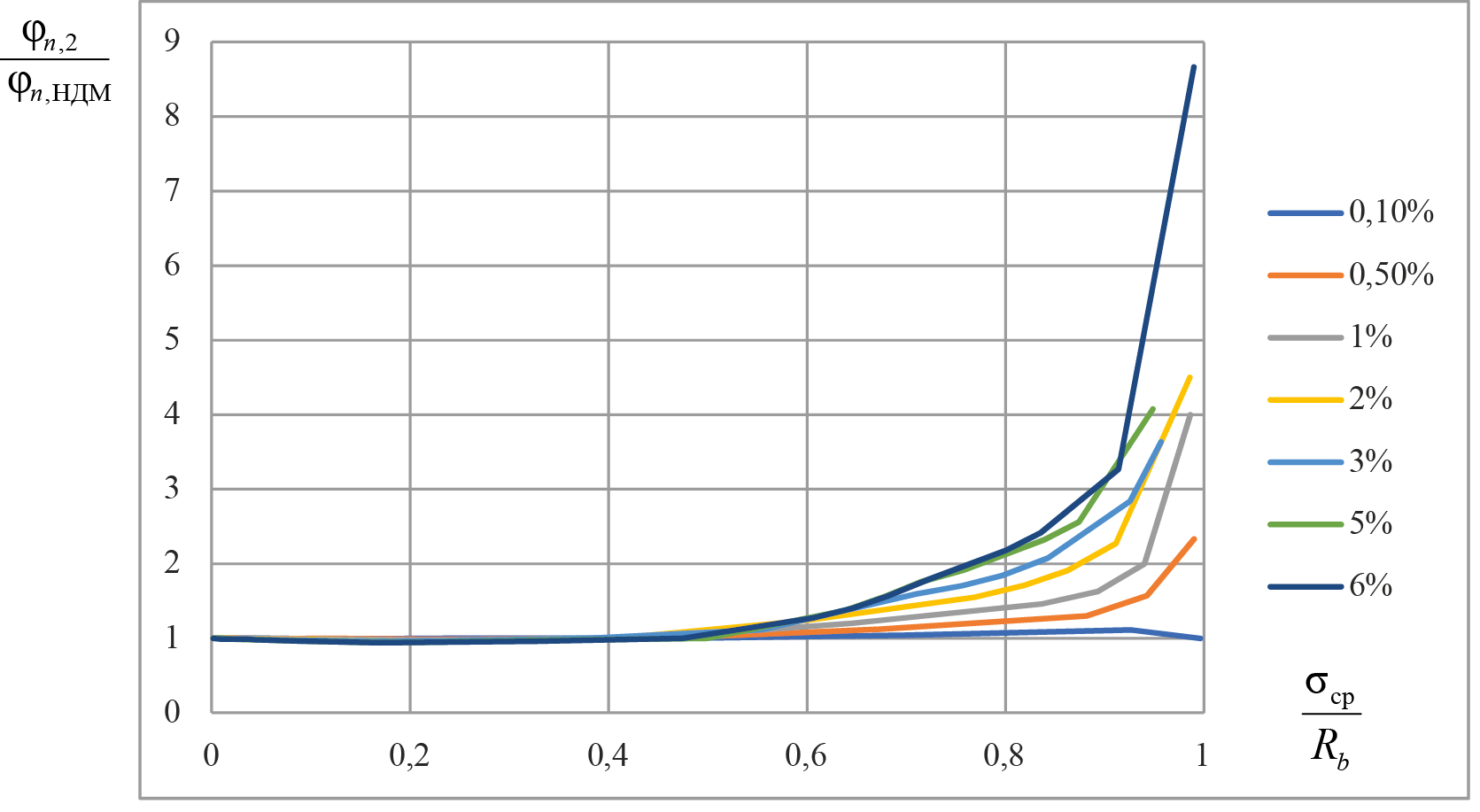 Нельзя не заметить, что в нормах сейчас имеется ситуация, при которой упрощенная методика определения величины сжимающих напряжений с применением коэффициента упругости бетона, определяемого по вершине криволинейной диаграммы (методика 2), показывает приемлемую сходимость для элементов с малым содержанием арматуры (до 1 %) по сравнению с точным определением напряжений по НДМ. Однако с ростом содержания арматуры до 6 % расхождение значений коэффициентов φn по точной методике и упрощенной методике 2 увеличивается. Причем одновременно с увеличением армирования наблюдается снижение уровня нагружения, при котором увеличивается это расхождение – от 0,94 при μ = 1 % до 0,8 при μ = 6 % соответственно. Графически отклонения значений по упрощенной методике 2 от НДМ при различном содержании армирования приведены на рис. 10.
