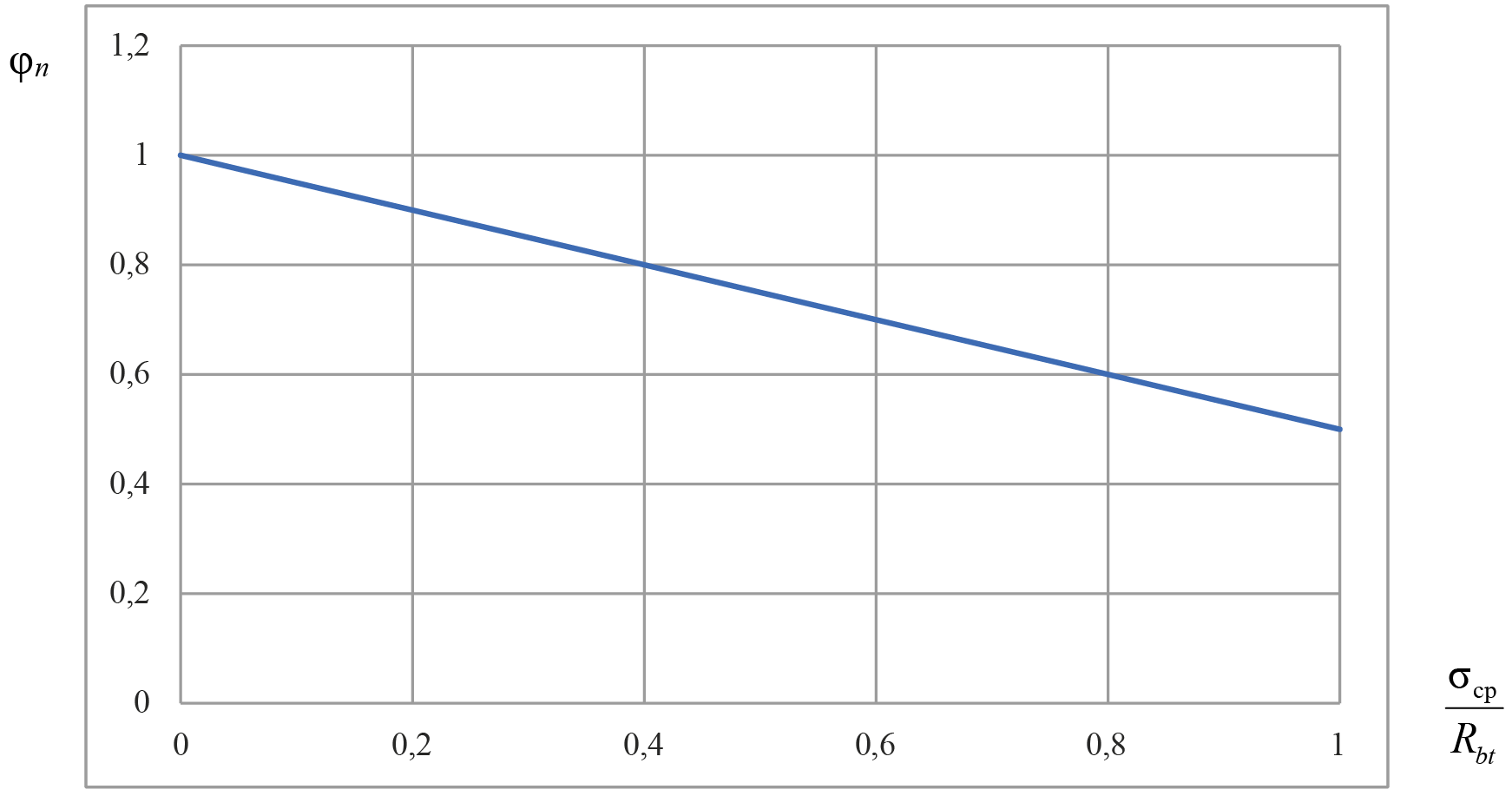 Рис. 5. Нормативная зависимость значения коэффициента φn при действии продольных растягивающих сил от соотношения σср/Rbt