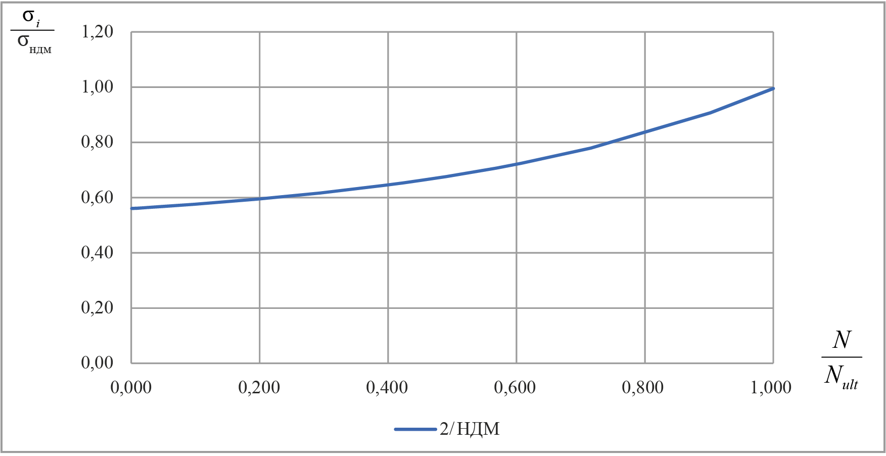 Рис. 3. Соотношение значений средних сжимающих напряжений, определяемых по методу 2, при содержании арматуры 6 %: σi – напряжения, определяемые по упрощенному методу 2; σндм – напряжения, определяемые по НДМ