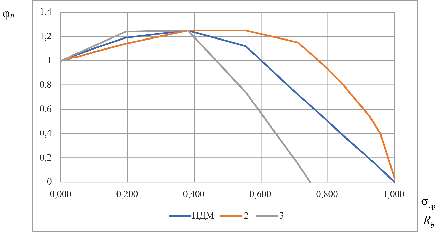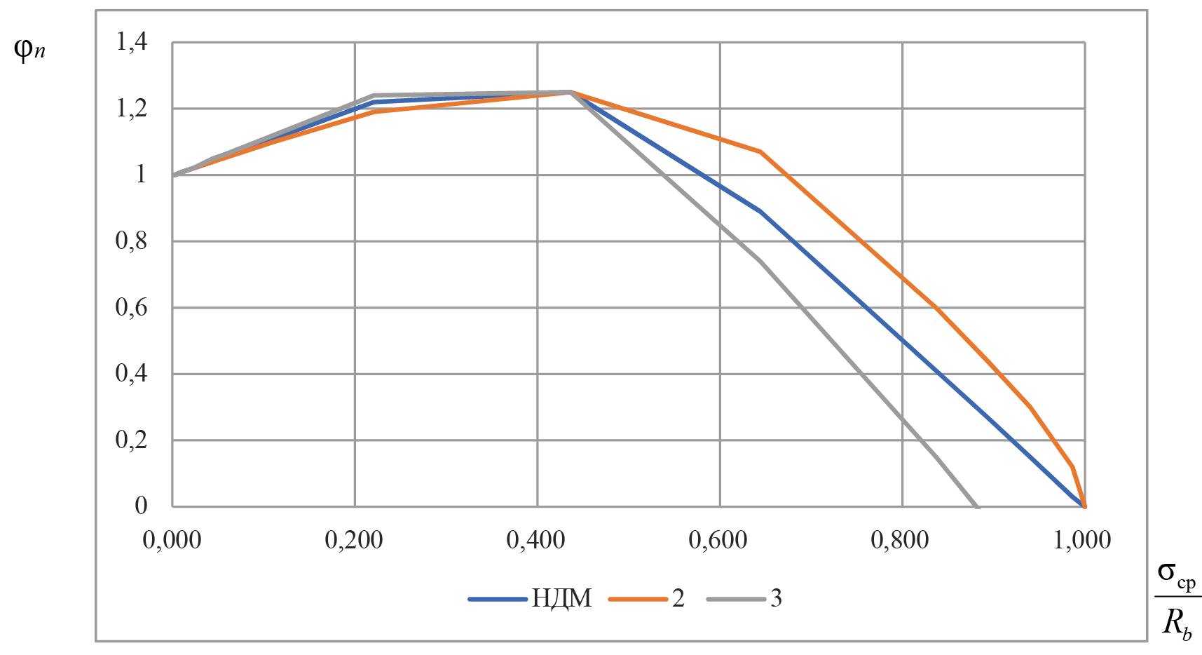 Рис. 4. Нормативная зависимость значения коэффициента φn при действии продольных сжимающих сил от соотношения σср/Rb