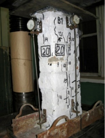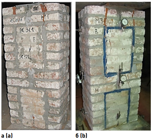 Образцы имели габариты в плане 0,38 × 0,51 × 1,2 м и 0,42 × 0,57 × 1,2 м. Кладка образцов серии М2 велась из кирпича «Манеж» на растворе прочностью 3,3 МПа. Кладка образцов серии БТ-Иэп-тр велась из отобранного с Большого театра кирпича М100 и М50 на растворе низкой прочности 0,2 МПа. Образцы испытывались на центральное сжатие в гидравлическом прессе (рис. 5а).