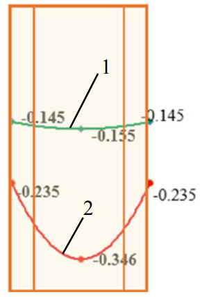 Рис. 10. Эпюры вертикальных деформаций ε × 10-2 в средней по высоте части образца № 1-4д серии М4-ЦС при уровнях нагрузки: 1 – N = 0,5Nu2 – = 0,8Nu