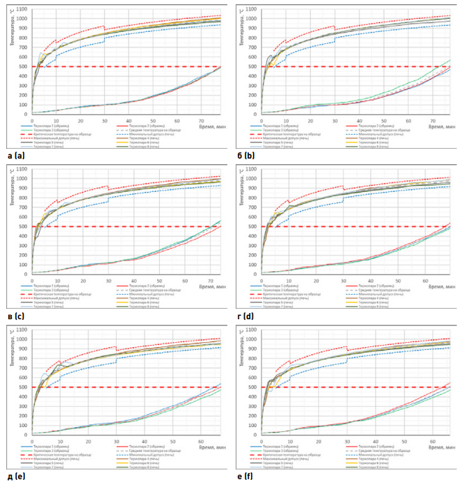 Рис. 8. Изменение температуры в печи и на образце в процессе испытания: а – контрольный образец без старения; б – после 25 циклов старения; в – после 50 циклов старения; г – после 75 циклов старения; д – после 100 циклов старения; е – после 125 циклов старения