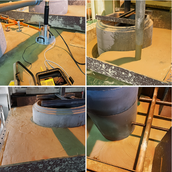 На сегодняшний день в ряде стран, в частности в Германии, выполнялся проект в рамках независимого сравнительного исследования IKT (Gelsenkirchen) с участием крупных производителей таких смесей, как RSS® Flüssigboden от FiFB GmbH, TerraFlow® и др., где проводились испытания в масштабных 1:1 тестовых траншеях с моделями труб и канализационных шахт. Смеси заливались без виброуплотнения и сравнивались по способности к равномерному обтеканию труб, однородному затвердению и возможности повторной выемки при необходимости. На рис. 5 изображен лабораторный стенд IKT с крупномасштабными моделями канальных траншей, где смесь заливается в имитированную траншею с трубами и люками, свободно обтекает конструкции и заполняет все полости. После заливки Flowable fill формирует однородную плотную структуру, позволяющую оценить поведение смеси в реальных условиях. В результате исследования состав получил оценку «очень хорошо» – смесь превосходно соответствовала требованиям по стабильности, обтеканию и обратимости и уже используется на практике в городах Германии.