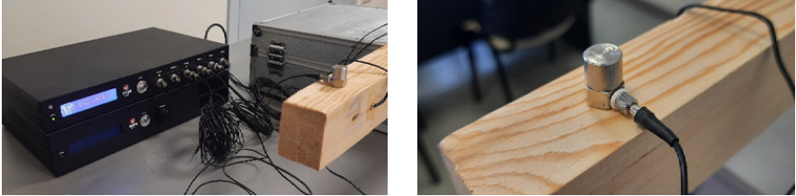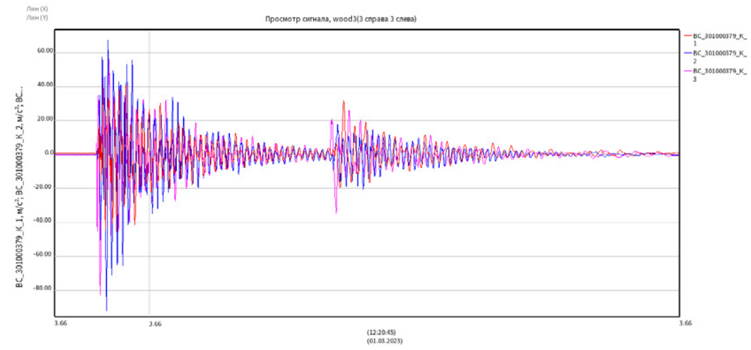 В целях определения показателей затухания были проведены вибрационные испытания на цельнодеревянных образцах с использованием измерительного комплекса ВС-301 производства ООО «ВИСОМ» (Смоленск) (рис. 3). Результаты, полученные на образцах с размерами 1200 × 70 × 50 и 2200 × 150 × 75 мм, представляют собой акселерограммы (рис. 4, 5). Образцы подвешиваются на пружинных или резиновых подвесах с целью исключения влияния реакций опор, внешних вибраций. Так называемое «обезвешивание» образцов позволяет исключить внешние воздействия. Не критично, но желательно распределить подвесы таким образом, чтобы обеспечить равномерное опирание с целью распределения изгибающих моментов от действия собственного веса образца. Вибрационные датчики регистрируют ускорения, полученные массивы данных обрабатываются для достижения целей эксперимента.