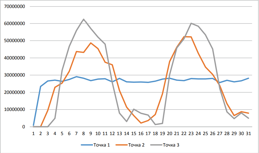 Получены графики нормальных напряжений в указанных точках (рис. 2). Значения напряжений в точках вычислены по формуле (1). Скорость волны напряжения c0 принимается из известной зависимости, по модулю упругости и плотности древесины сосны: