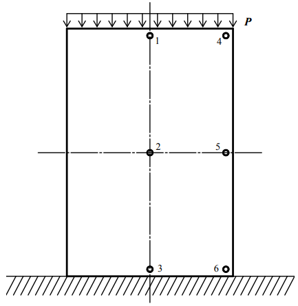 Численный эксперимент моделирует процесс сопротивления цельнодеревянного образца с размерами a × b × h, 100 × 100 × 150 мм, нагружаемого осевой силой в 40 тонн. Нагрузка прикладывается внезапно (импульсно, за короткое время), за 10 микросекунд. Продолжительность описания процесса волнового распространения напряжений до наступления стабильного состояния покоя колеблется около 60 сек, в зависимости от заданных условий. Характерные точки обозначены на вертикальной осевой линии срединной плоскости образца (рис. 1). Это три точки – на свободной площадке приложения нагрузки, в середине и у опоры. Искомое значение напряжения в точке, если воспользоваться условием прочности по Мизесу, как эквивалентное напряжение с учетом составляющих нормальных напряжений по осям X, Y и Z определяется по формуле: